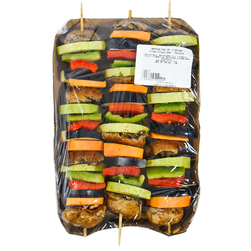 Brochetas de verduras frescas y coloridas, listas para cocinar. Esta bandeja incluye una variedad de verduras como pimientos, cebollas, champiñones y tomates cherry, perfectas para asar a la parrilla o cocinar a la plancha. Una opción saludable y deliciosa para acompañar tus comidas.