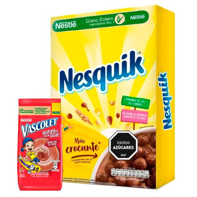 El Cereal NESQUIK matinal 210 g es un delicioso cereal de chocolate que brinda una alimentación balanceada. Viene acompañado con un regalo de VASCOLET de 80 g, una popular bebida achocolatada, perfecta para complementar tus desayunos. Ideal para disfrutar un inicio de día energético y sabroso.
