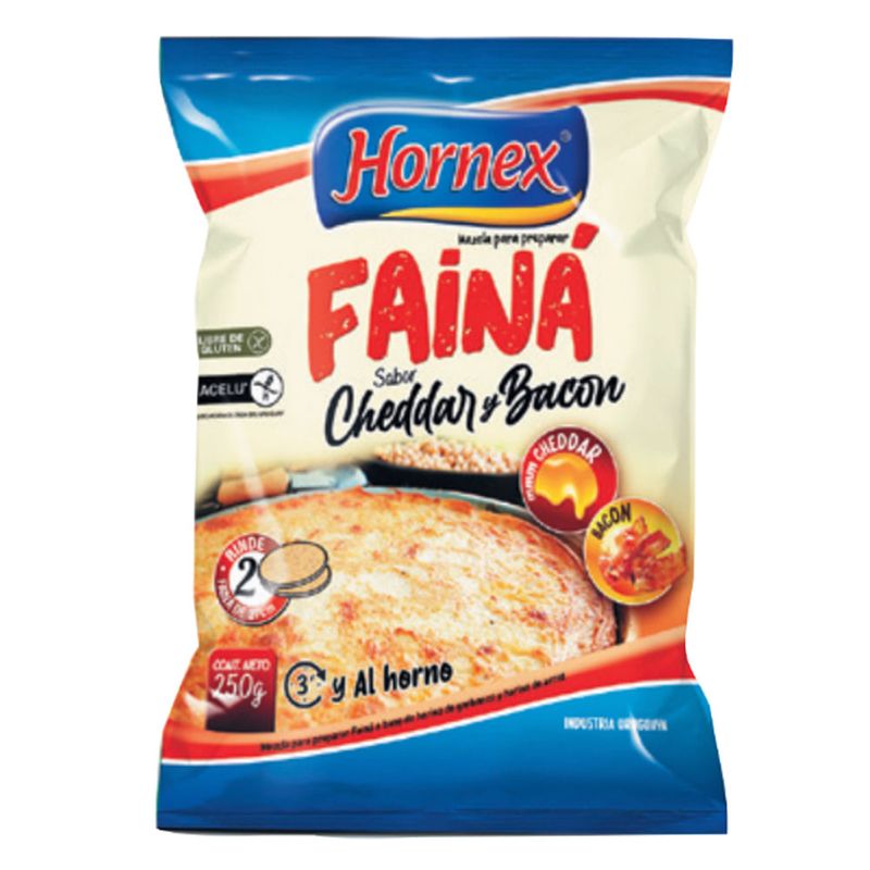 Fainá cheddar y bacon Hornex, 250 g, una deliciosa combinación de sabores para disfrutar como acompañamiento o snack.