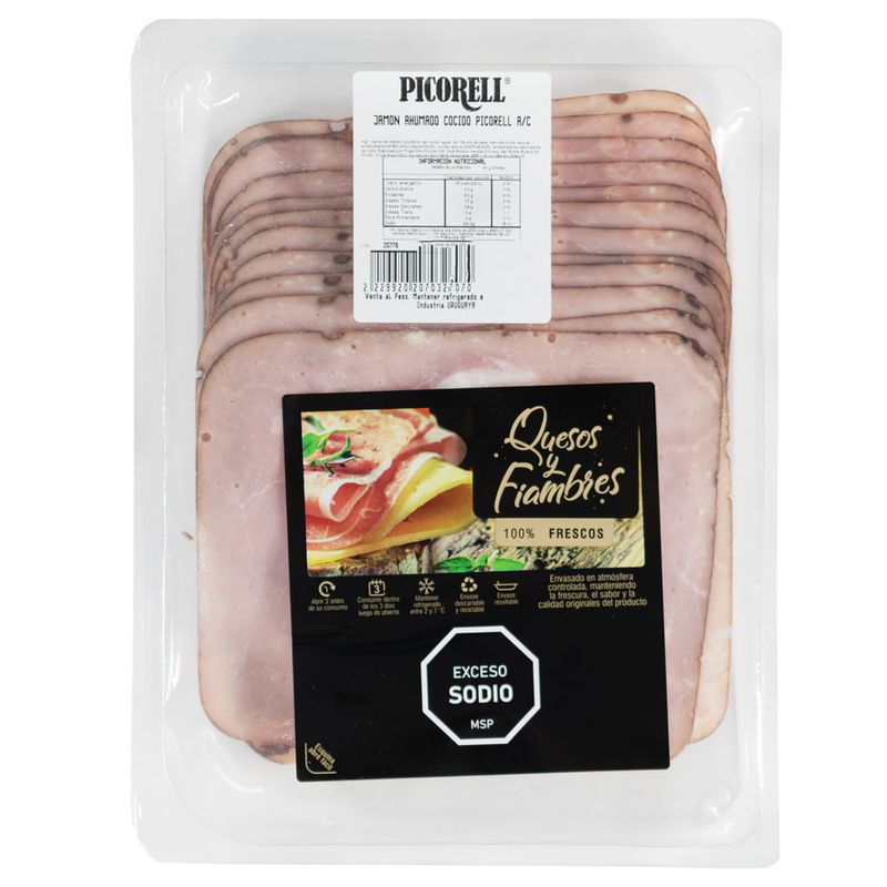 El jamón cocido ahumado Picorell de atmósfera controlada es un producto de alta calidad elaborado con técnicas tradicionales y tecnología avanzada. Su sabor ahumado y su textura suave lo hacen perfecto para un bocadillo o como ingrediente en ensaladas y platos fríos.