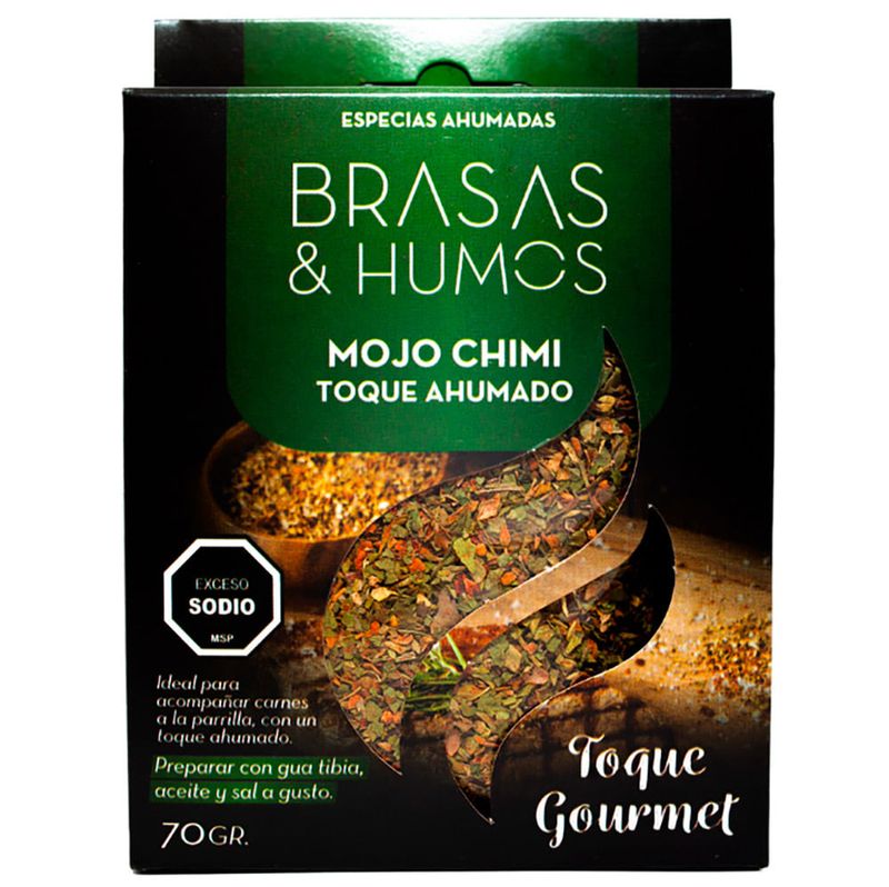 Mojo Chimi Toque Ahumado BRASAS y HUMOS es una mezcla adobada de 70g, con un magnífico sabor ahumado. Ideal para marinar carnes y intensificar la sazón de tus platos. De fabricación española, está hecho con ingredientes naturales y embalado en un frasco práctico y reutilizable.