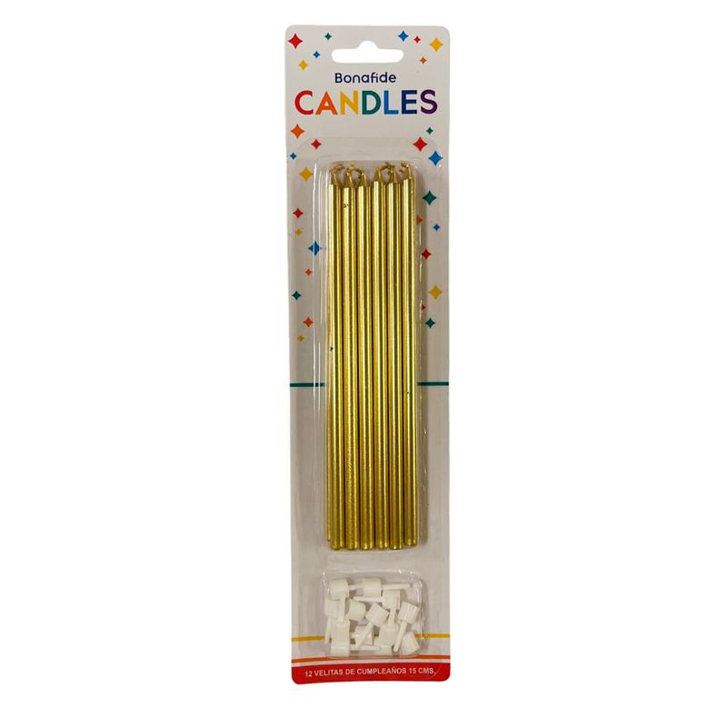 El set de velas en dorado incluye 12 unidades con soporte, perfectas para añadir un toque elegante a cualquier ocasión especial. El soporte proporciona estabilidad y seguridad al colocar las velas.